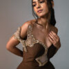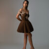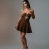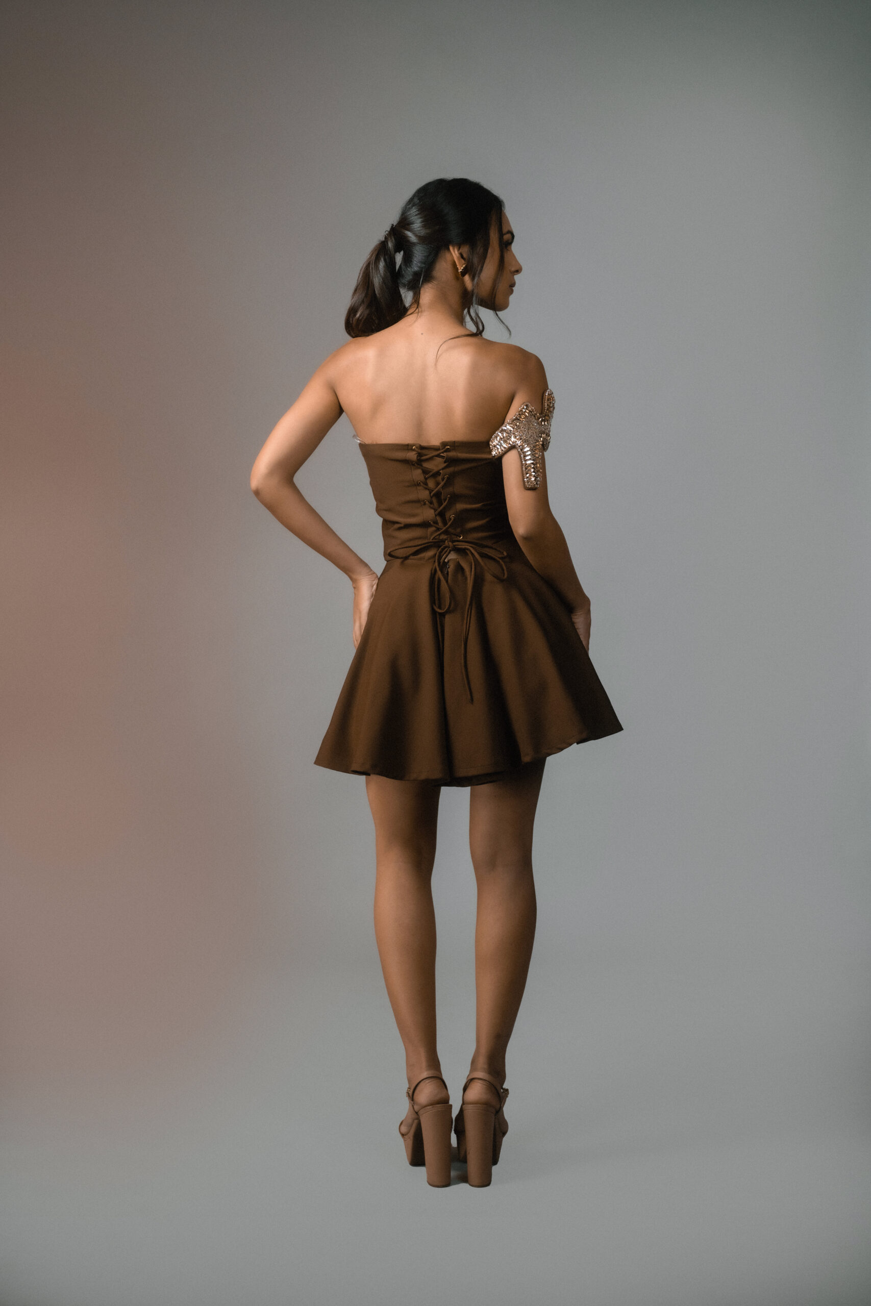 The Doll Daze Dress is your softest high: a one-shoulder cocoa-toned mini with sculpted bust cups and a twirl-worthy flared skirt. Gold-toned hand embroidery dances across the neckline in a whimsical wave, catching light with every move.