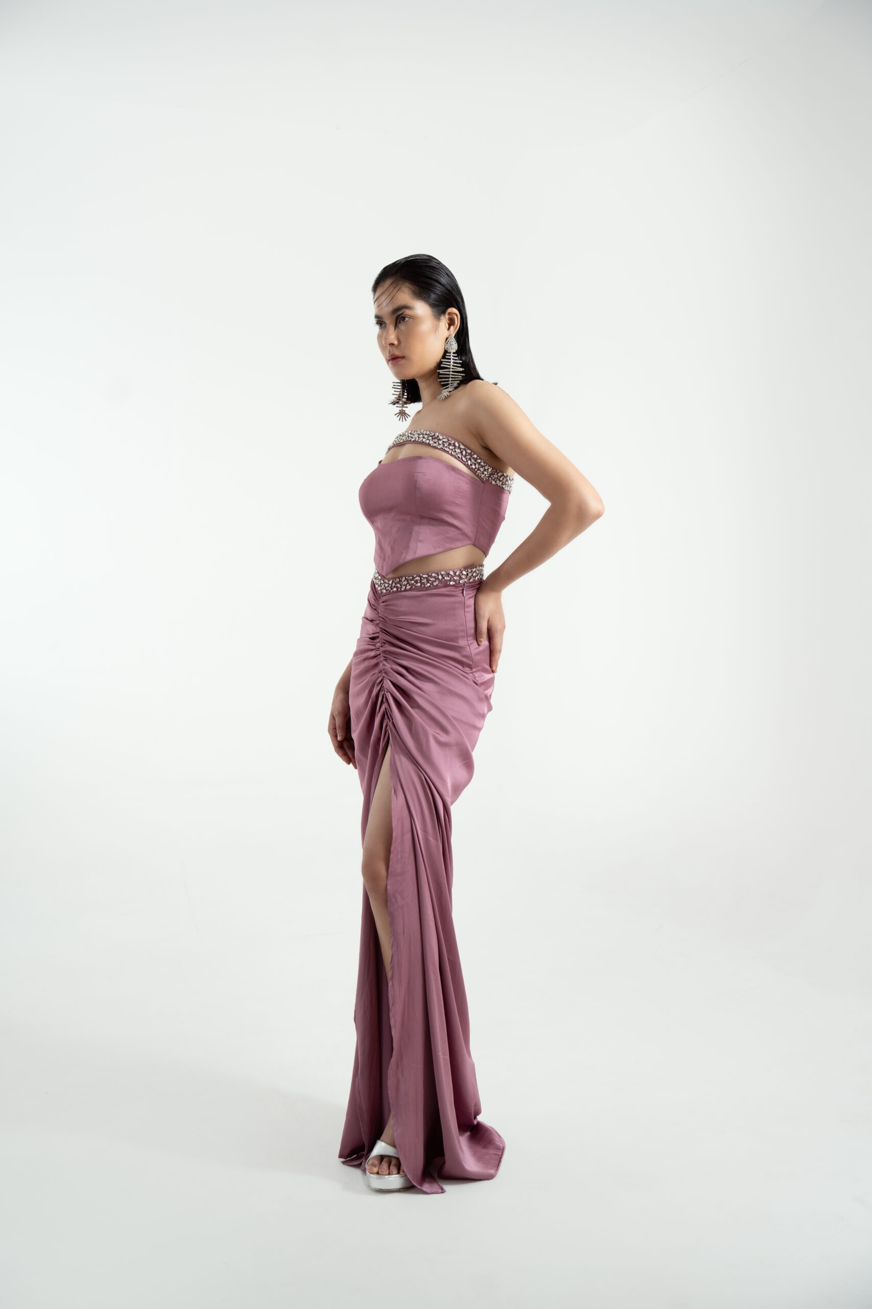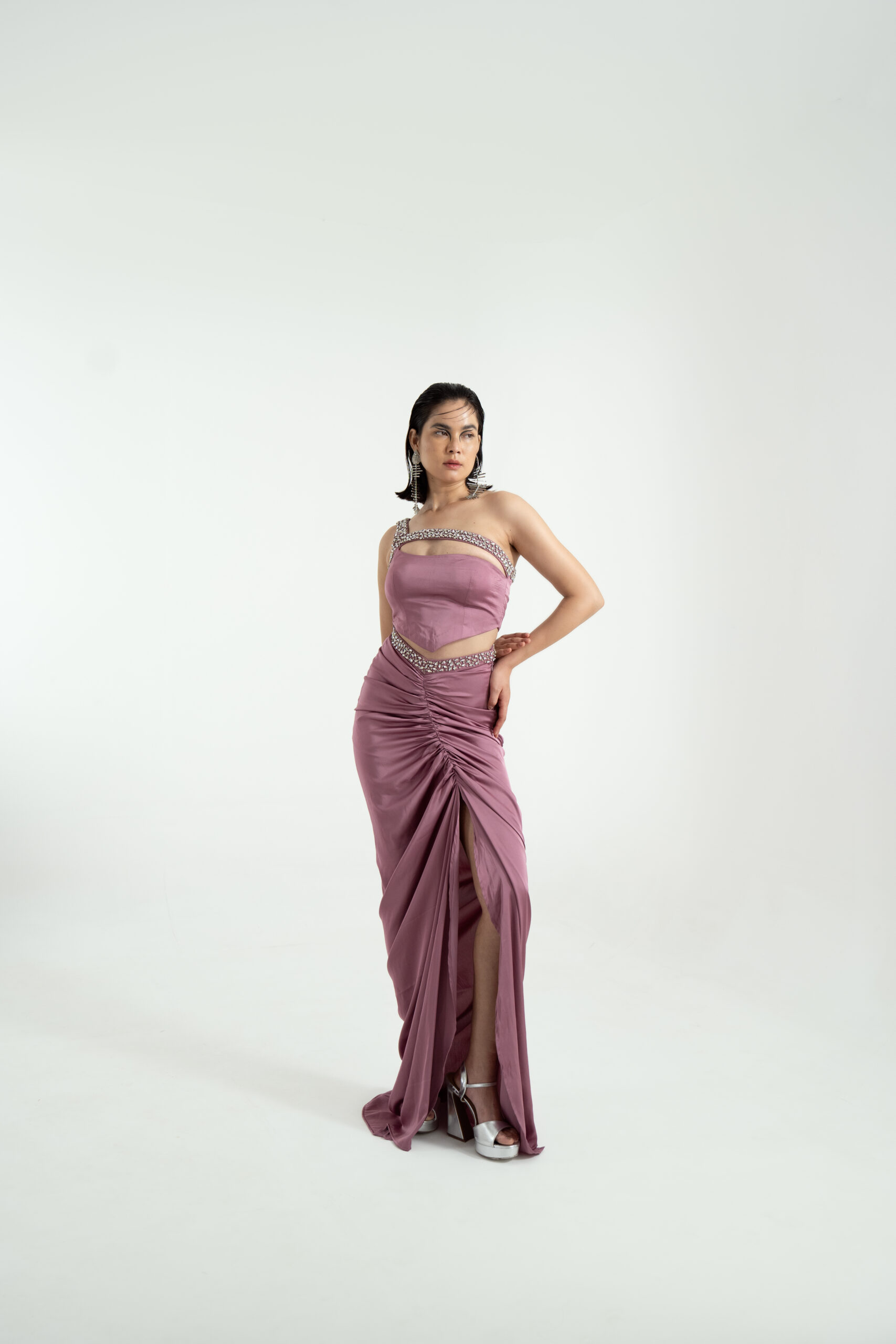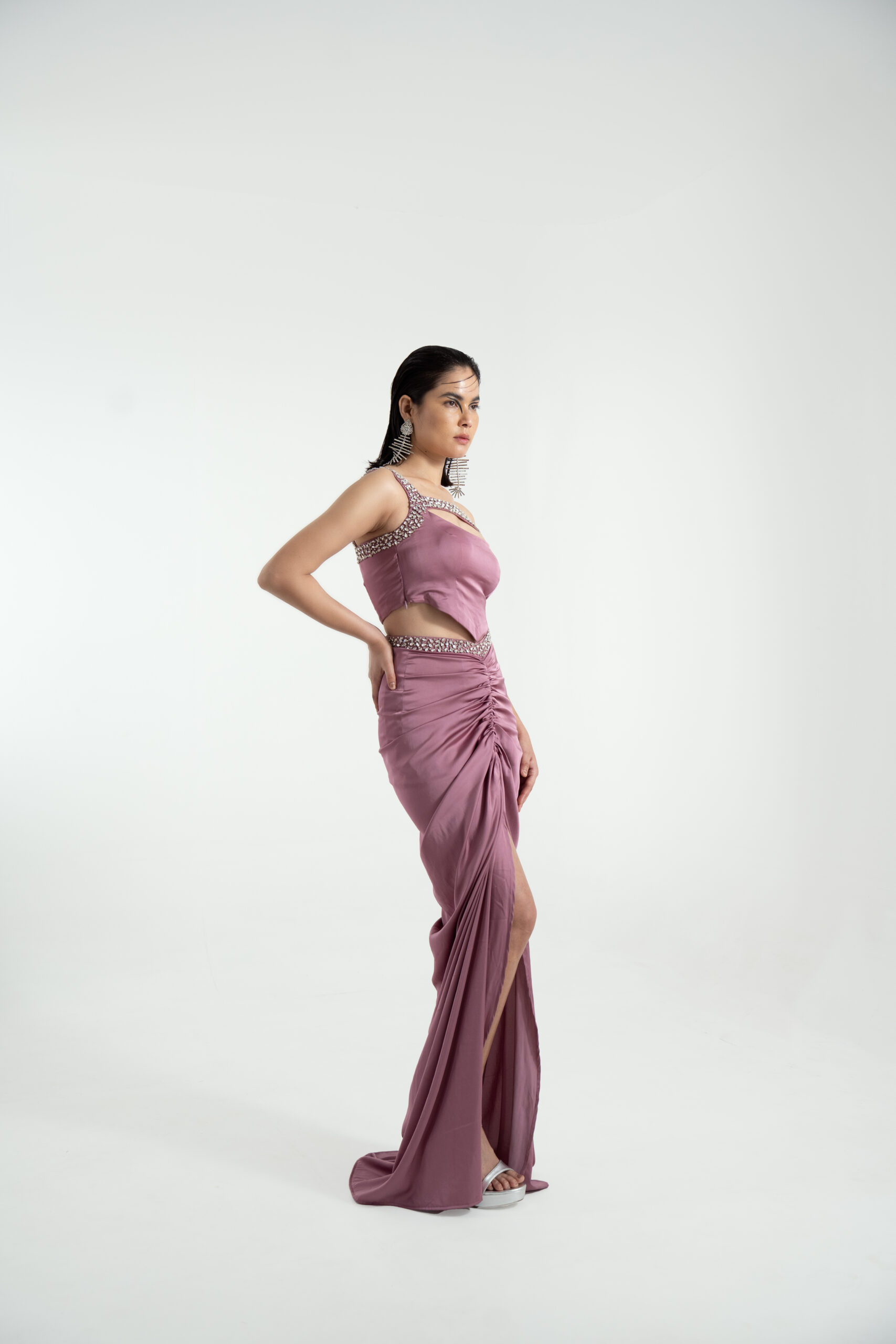 A vision draped in mystique ,Mystic Vision is a two-piece set crafted in imported satin, brought to life with delicate hand-embroidered detailing. Designed in soft cosmic tones, this ensemble flows with elegant gathers that mirror the ever-unfolding thoughts of the dreamer symbolic of how our inner universe weaves reality. The shimmering stonework echoes celestial alignment where manifestation meets movement.