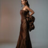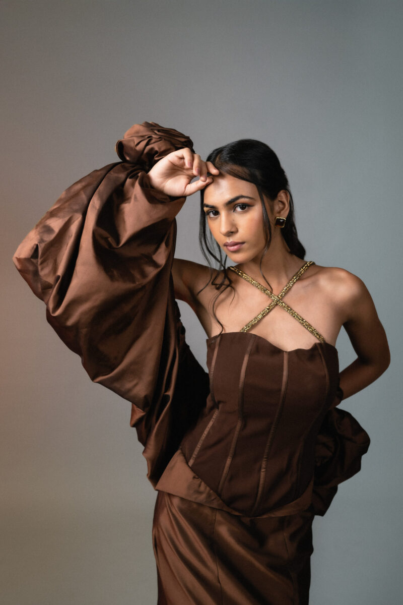 The bodice is crafted from premium imported crepe, flowing into a taffeta satin silk skirt that moves with softness and intent. The neckline is intricately hand-embroidered, and the draped stole detail creates a sense of both elegance and quiet vulnerability.