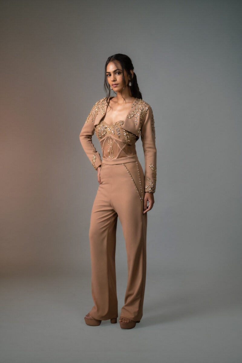 Step into a world where dreams shimmer into reality. The Seraphic Dream is a celestial jumpsuit that captures the magic of the universe in every sequin. Crafted to embody your most divine, radiant self, this piece blends structured elegance with cosmic sparkle. The silver handwork and mauve sequins reflects the elements of the universe stars, galaxies, and infinite potential wrapped into one powerful silhouette. Designed for the woman who’s ready to shine on her terms.